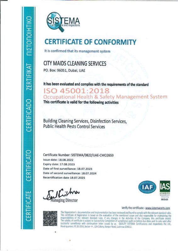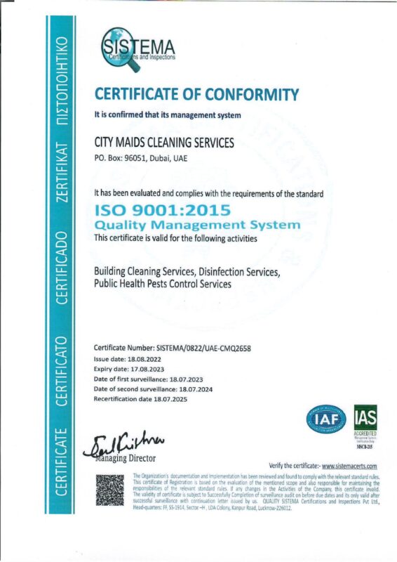 City Maids proudly celebrates a significant milestone in our long standing pursuit of excellence, growth, and responsible service delivery. Earning both ISO 9001 and ISO 45001 certifications marks a defining moment in our commitment to operating at the highest international standards. These achievements affirm not only the strength and maturity of our internal systems, but also our dedication to protecting the well being of our team and reinforcing the trust placed in us by households across the communities we serve. As our range of residential services continues to expand, these certifications underscore our promise to maintain exceptional quality, consistency, and operational integrity at every level.